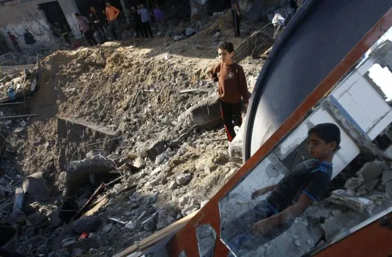 Palestiinalainen lapsi seisoo Israelin pommittaman talon vieressä Gazan kaupungissa tiistaina 20. marraskuuta. Kuva Hatem Moussa / AP / Lehtikuva.