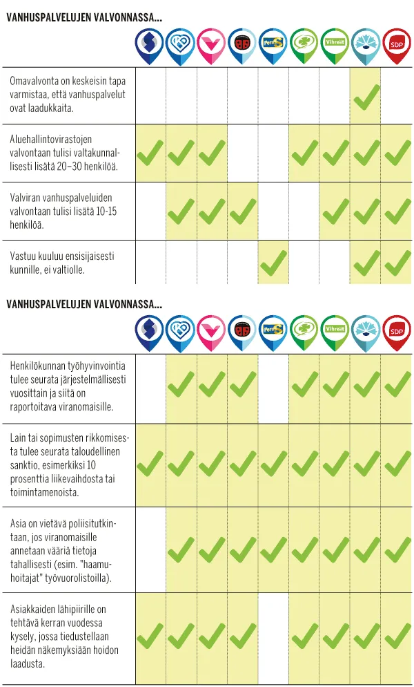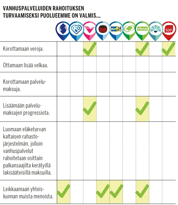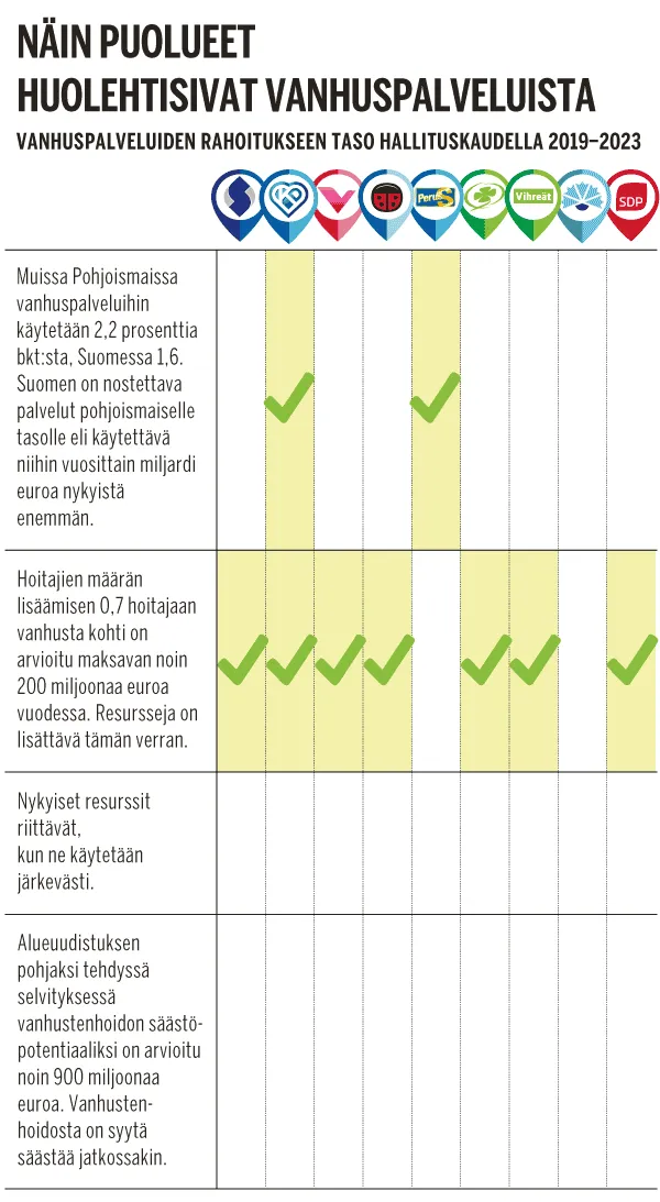 Vaikeampi kysymys on se, mistä rahat vanhustenhoitoon ja viranomaisten valvonnan lisäämiseen otetaan. Tämä käy ilmi kyselystä, jonka Suomen Kuvalehti teki kaikille yhdeksälle nykyiselle eduskuntapuolueelle.