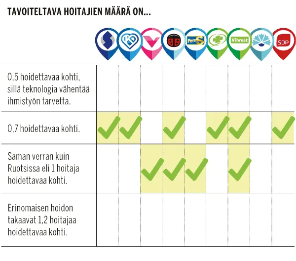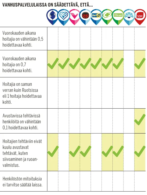 Puolueista vain Sdp kirjaisi lakiin hoitajamitoituksen lisäksi myös vähimmäismäärän avustavalle henkilöstölle.