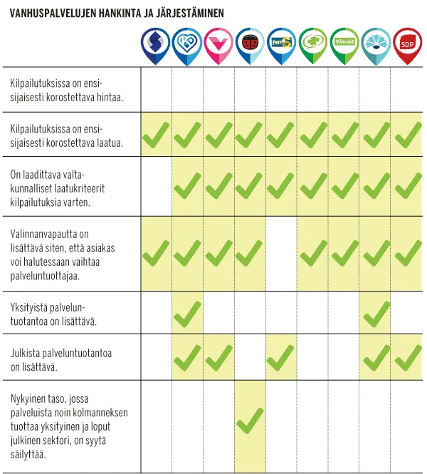 Suurin kipuilija on kokoomus, joka ei kannata kyselyssä hoitajamitoituksen kirjaamista vanhuspalvelulakiin. Kokoomus ei myöskään sitoudu lisäämään vanhuspalveluiden rahoitusta seuraavalla hallituskaudella vähintään 200 miljoonalla eurolla, kuten muut puolueet.