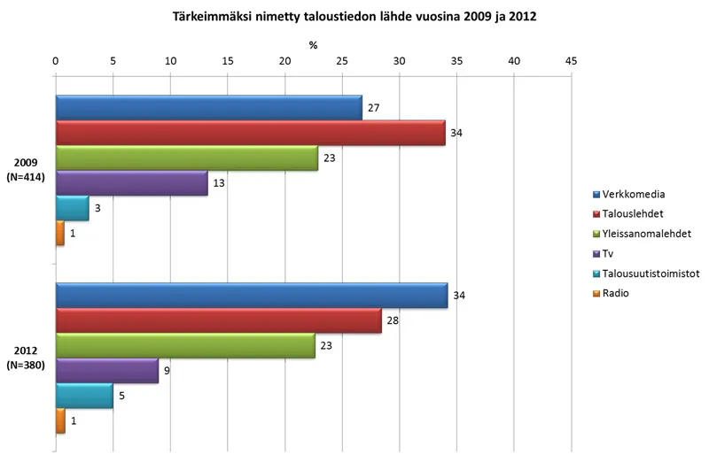 Kun vastaajia pyydettiin nimeämään tärkein taloustiedon medialähteensä, 34 prosenttia nimesi verkkomedian. Vuonna 2009 taloussanomalehdet pitivät vielä ykkössijaa täsmälleen samalla kannatuslukemalla.
