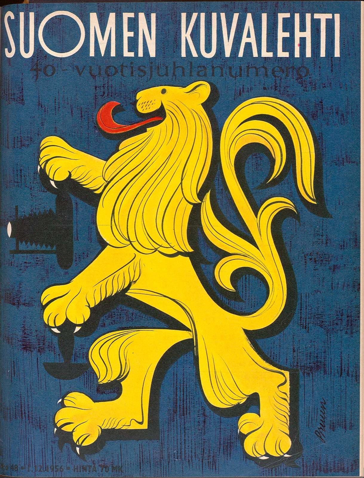 Ja toki Erik Bruunin kädenjälki on näkynyt myös Suomen Kuvalehdessä. Hänen tulkintansa SK:n tunnusleijonasta ilmestyi lehden 40-vuotisjuhlanumeron kannessa joulukuussa 1956.