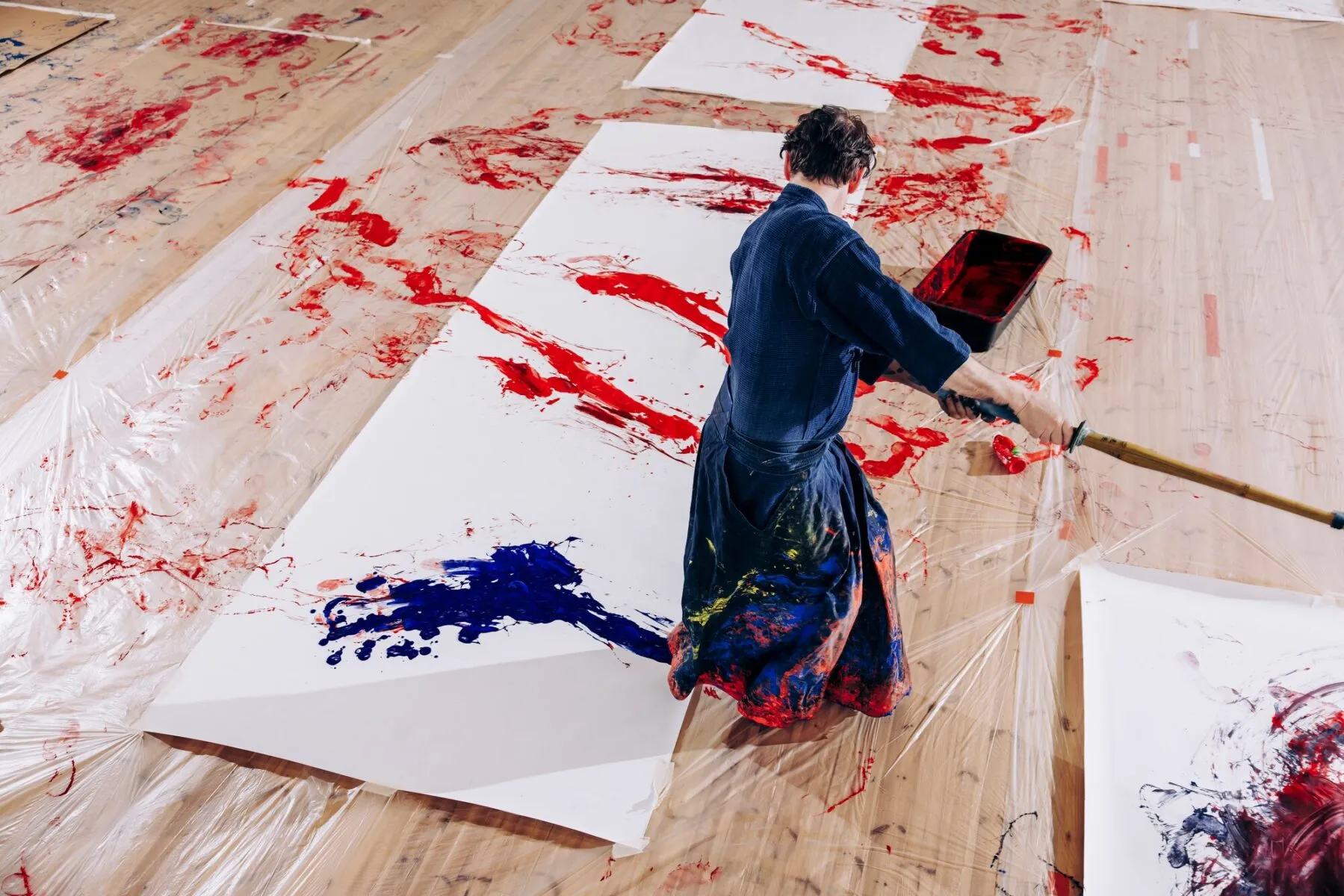 Markus Frey on kastanut hakaman siniseen maaliin, joka tekee dojon päälle levitetylle kankaalle liikkeiden perusteella näyttäviä kuvioita.