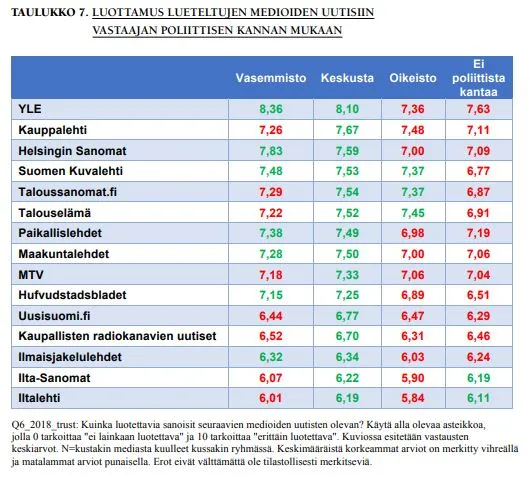 Vasemmistolaiset luottavat oikeistolaisia enemmän Yleisradioon, Helsingin Sanomiin, Hufvudstadsbladetiin, paikallislehtiin ja kaupunkilehtiin. Oikeistolaiset luottavat vasemmistolaisia enemmän Taloussanomiin ja Talouselämään. Tutkimus ei väitä, että nämä välineet olisivat itsessään johonkin suuntaan kallellaan.