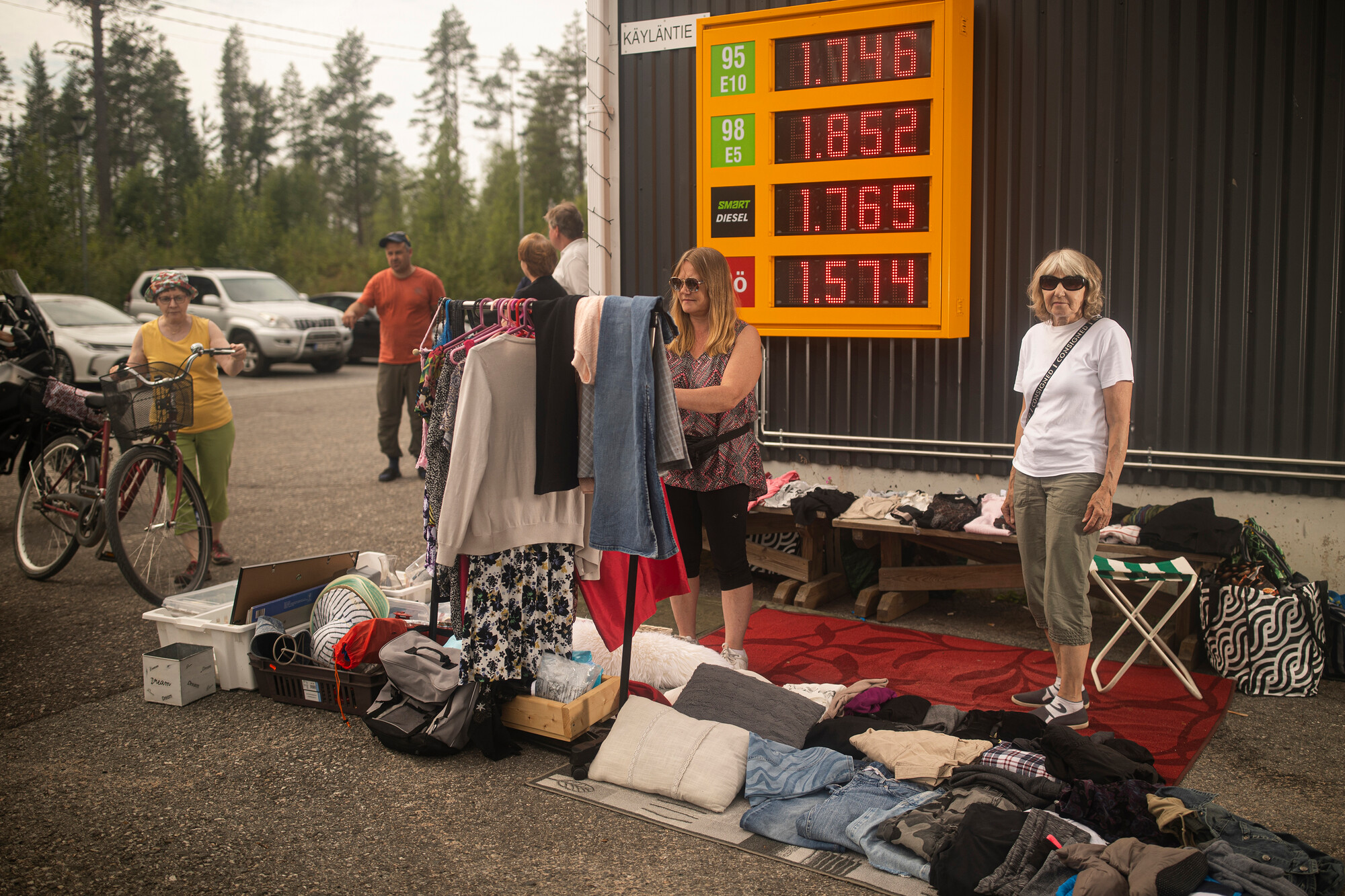 Kaksi sveitsiläistä miestä tankkaa välipalaa Käylän Salen parkkipaikalla. Ihmettelevät, miten lähelle rajaa pääsee ajamaan maastokelpoisilla moottoripyörillä Itä-Suomen roadtripillä.