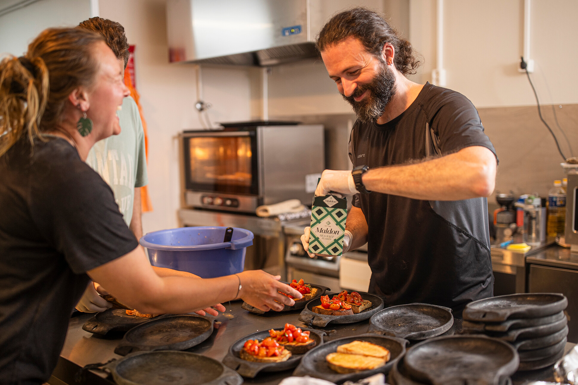 Sandaaleissa, sortseissa ja t-paidassa Kallberg ei näytä kokilta, vielä vähemmän entiseltä it-konsultilta. Myös tila on kokenut muodonmuutoksen pankin neuvotteluhuoneesta ammattikeittiöksi.