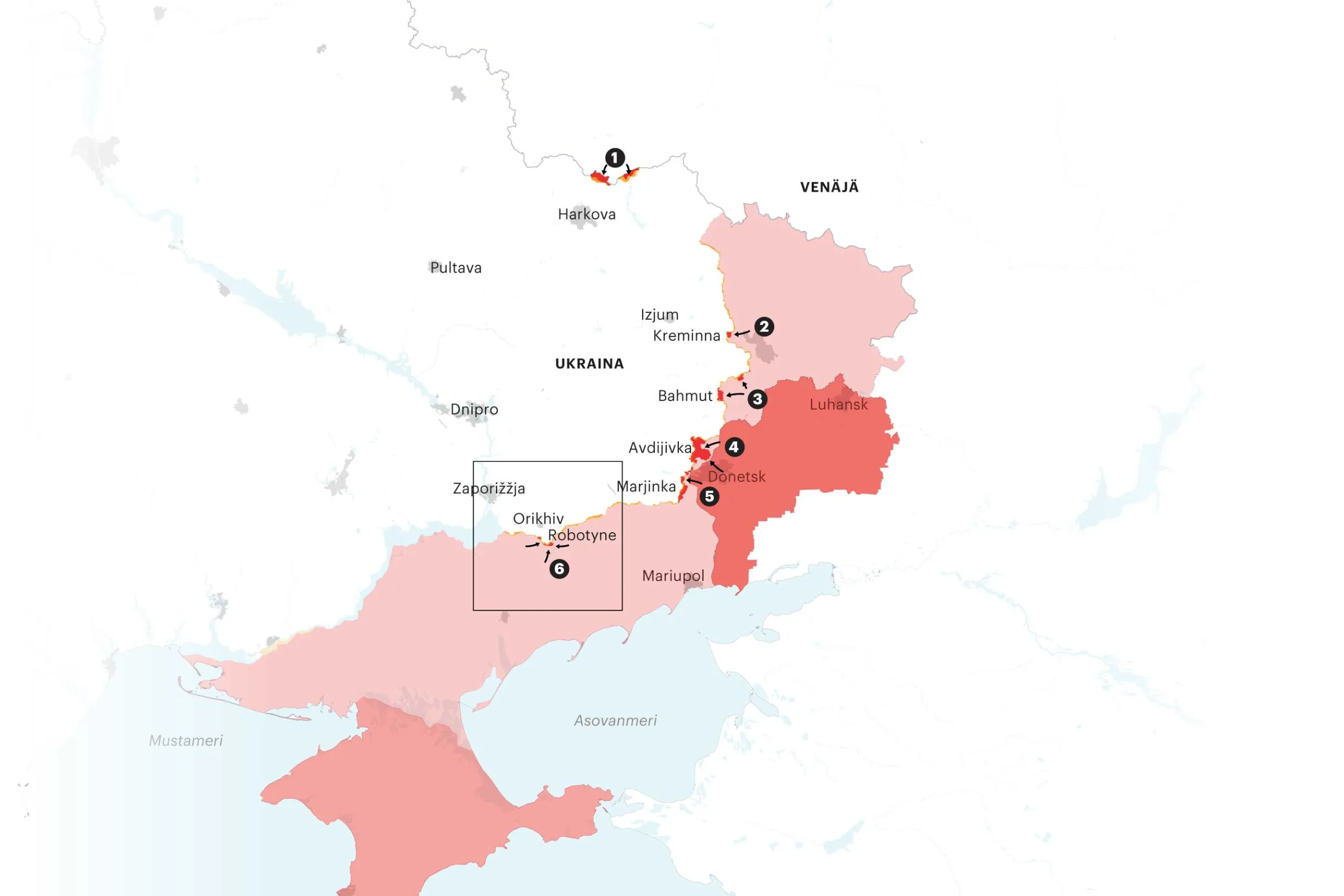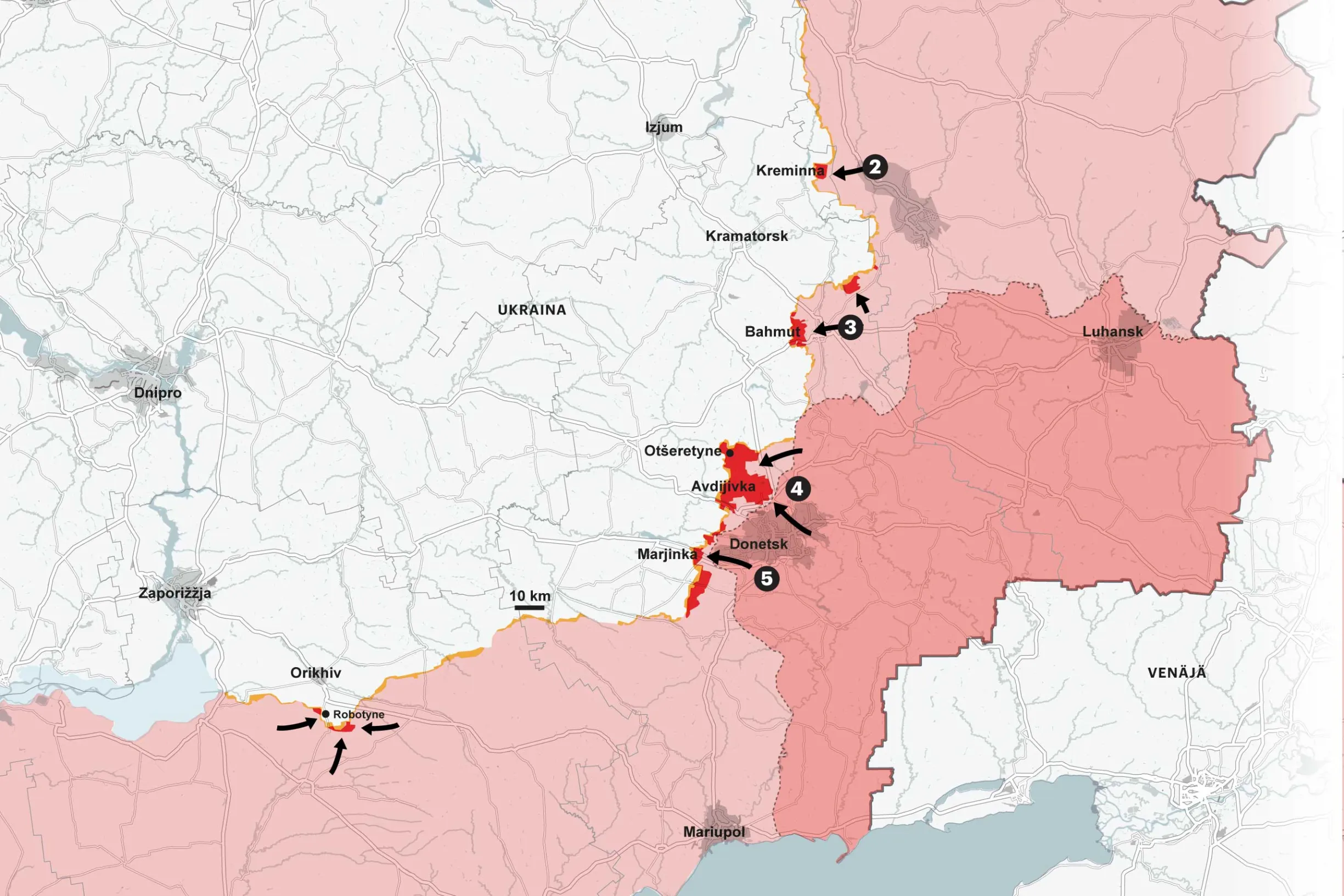 Viime aikoina tiedot ovat kertoneet Venäjän jatkuvasta etenemisestä erityisesti Itä-Ukrainassa. Liike on hidasta ja hyökkääjä kärsii koko ajan raskaita tappioita mutta suunta on selvä: Venäjä valtaa uusia alueita, ja Ukrainan joukot joutuvat perääntymään.