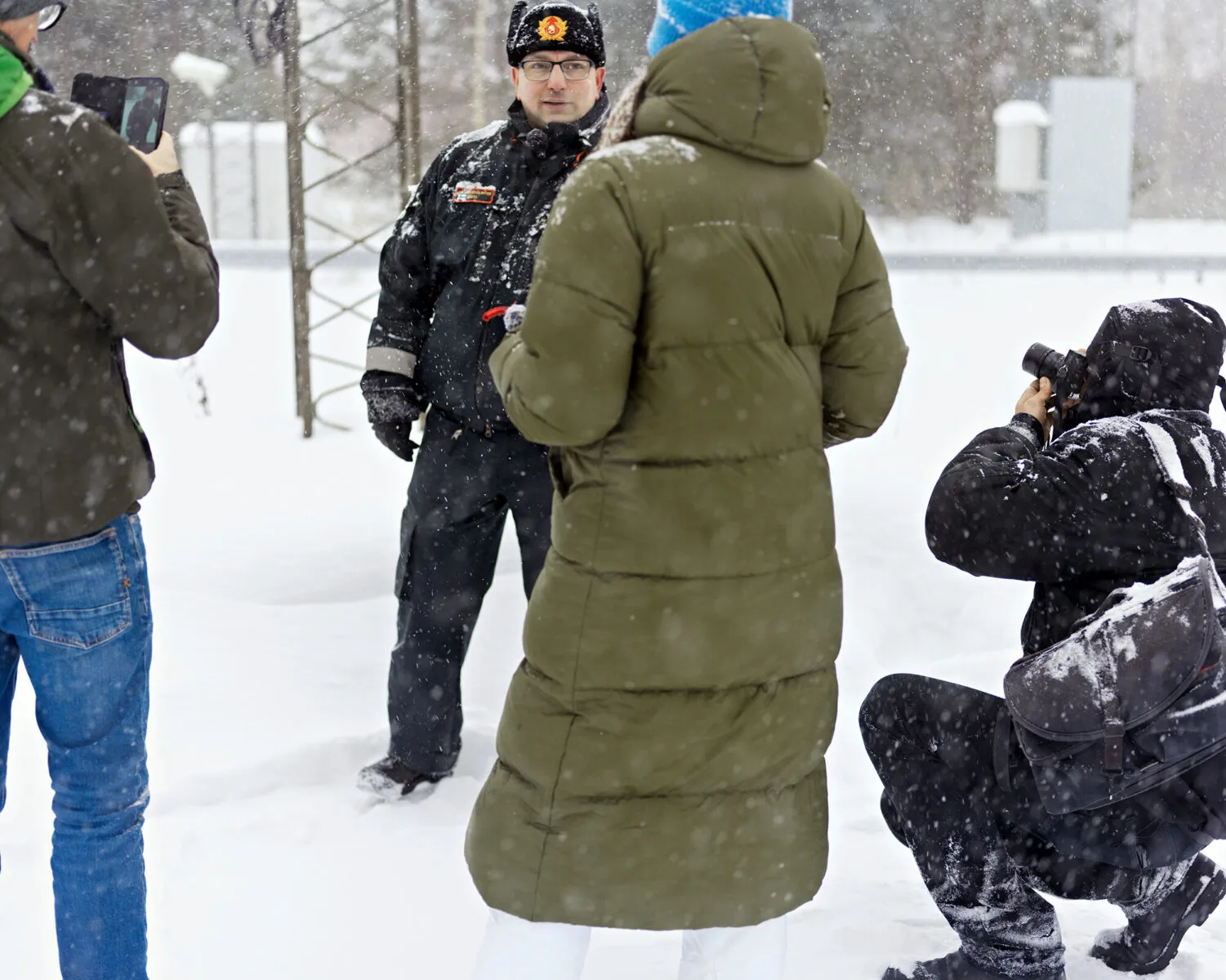 Kolme ulkomaista toimittajaa ja kuvaaja kuikuilevat harmauteen.