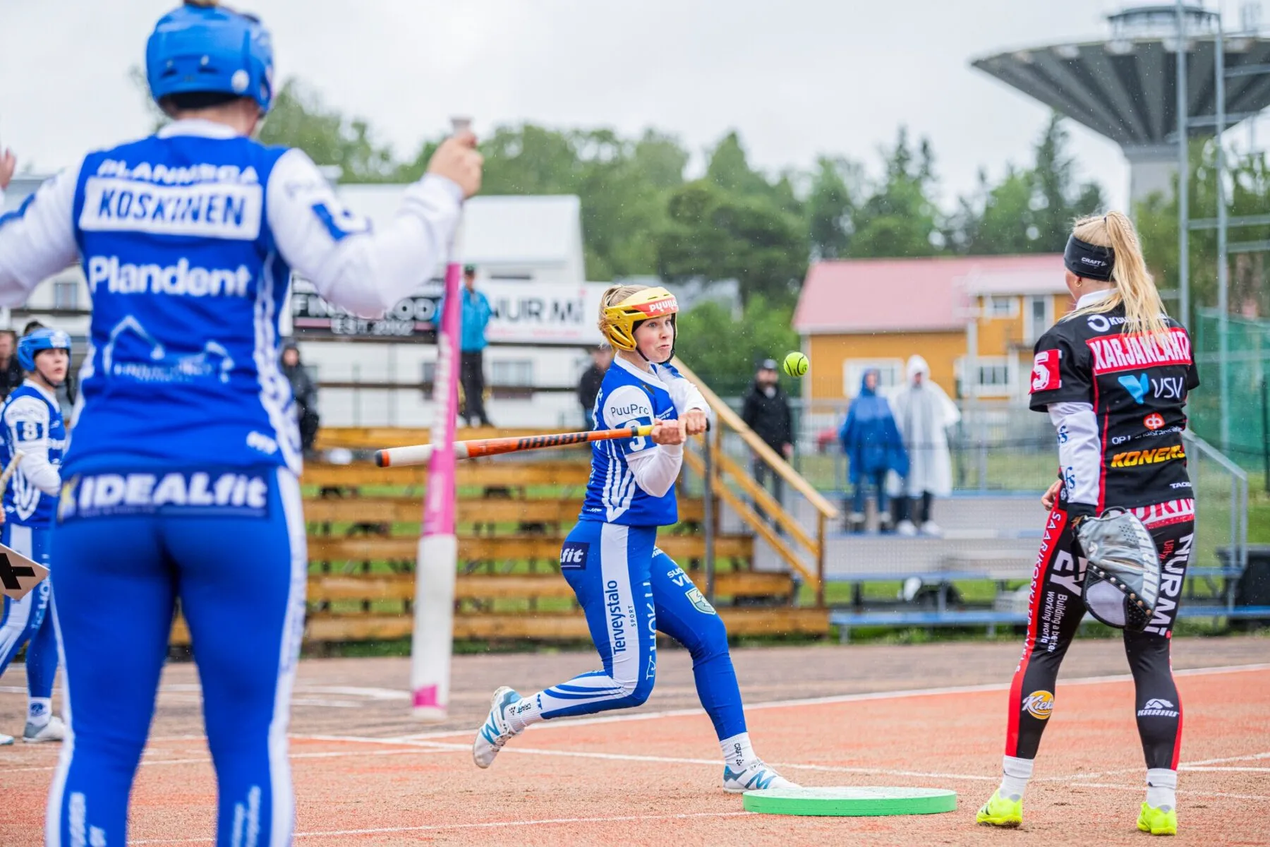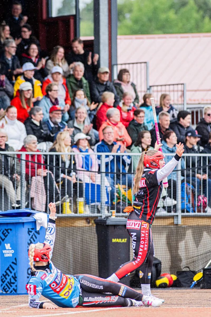 Pian kotiyleisö saa hurrattavaa. Roihun palautusheitto lentää ohi kotipesän. Kun lukkari Erica Rosendahl säntää hakemaan mansikkakojun suuntaan vierinyttä palloa, Laitilan Aada Heikkilä ja Jessika Sihvonen kipittävät kotipesään. Jyske siirtyy johtoon.