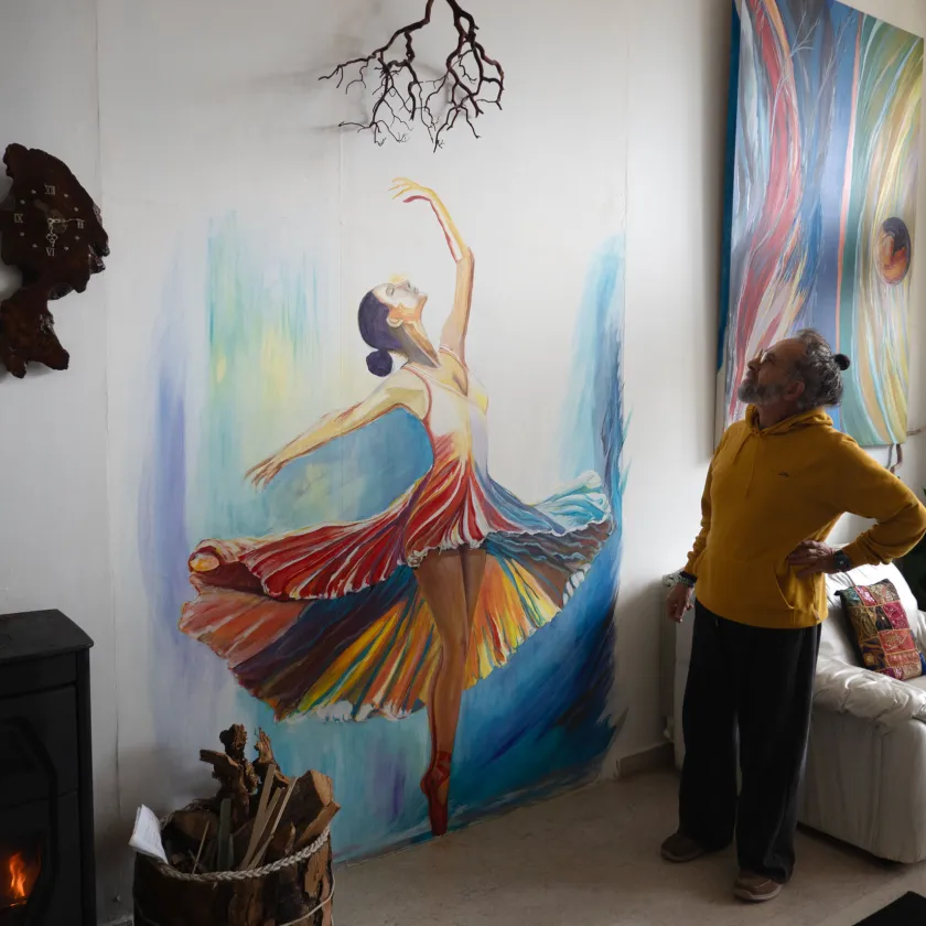 Koti on tilava talo, jonka ikkunoista avautuu maisema vuoristoon. Seinällä on hänen tekemiään värikkäitä maalauksia.